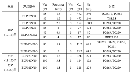 為用戶提供安全可靠的功率芯片一直是上海貝嶺功率器件產(chǎn)品的初心與使命,為此上海貝嶺聚焦市場(chǎng)需求、錨定產(chǎn)業(yè)發(fā)展,設(shè)計(jì)和研發(fā)出了更加安全可靠的鋰電池保護(hù)板用功率芯片。貝嶺SGT-MOSFET系列產(chǎn)品覆蓋寬范圍的電壓和電流等級(jí)和多種封裝形式,賦能更靈活高效的鋰電保護(hù)板設(shè)計(jì),滿足不同功率等級(jí)的鋰電保護(hù)應(yīng)用需求。產(chǎn)品的具體型號(hào)的及參數(shù)如表1所示。